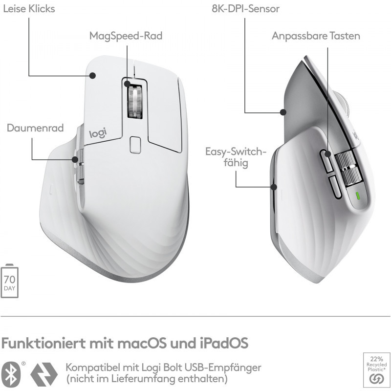 "Logitech MX Master 3S for Mac. Form factor: Right-hand. Movement detection technology: Laser, Device interface: Bluetooth, Movement resolution: 8000 DPI, Buttons type: Pressed buttons, Buttons quantity: 7, Scroll type: Wheel. Power source: Batteries. Works on any surface. Product colour: Silver, White"\n
