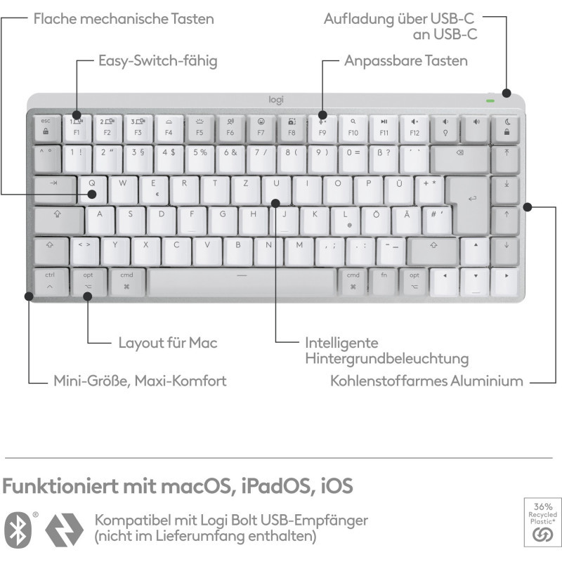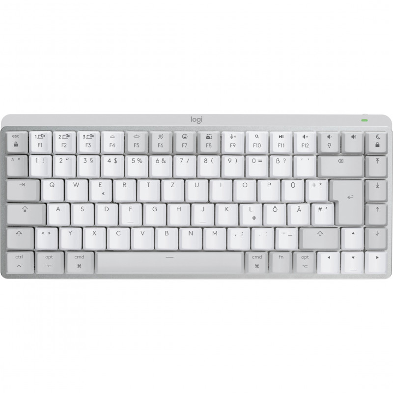 "Logitech MX Mechanical Mini for Mac. Keyboard form factor: Tenkeyless (80 - 87%). Keyboard style: Straight. Connectivity technology: Wireless, Device interface: RF Wireless + Bluetooth, Keyboard key switch: Mechanical, Keyboard layout: QWERTZ. Backlight type: LED. Cable length: 1 m. Recommended usage: Office. Product colour: Grey"\n