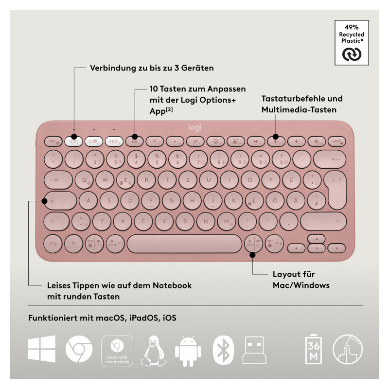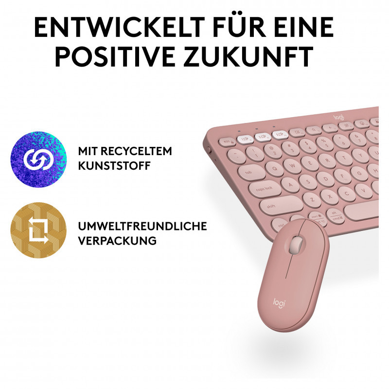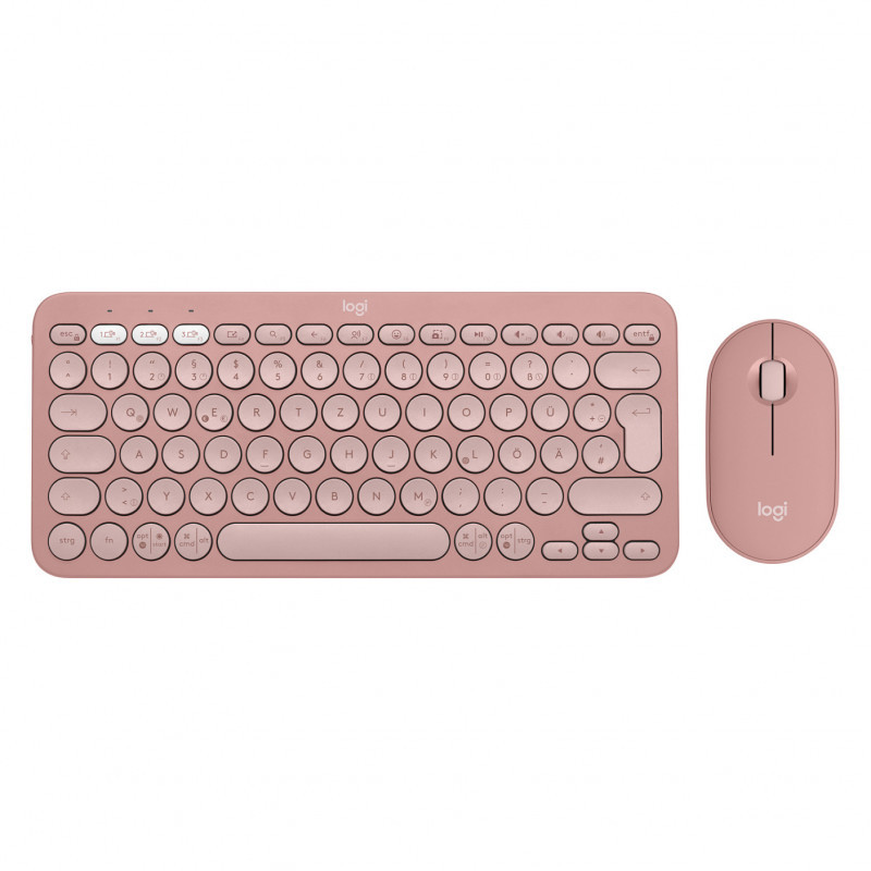"Logitech 920-012205. Keyboard form factor: Mini. Keyboard style: Straight. Connectivity technology: Wireless, Device interface: RF Wireless + Bluetooth, Keyboard key switch: Scissor key switch, Keyboard layout: QWERTZ, Recommended usage: Universal. Product colour: Pink. Mouse included"\n"HOW YOU EXPRESS YOURSELF IS UP TO YOU