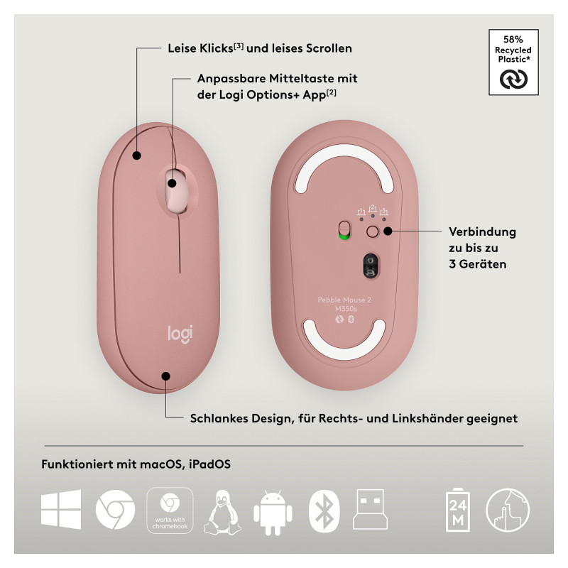 The plastic parts in Pebble 2 Combo include certified post consumer recycled plastic — Pebble Keys 2 K380s: 64% for Tonal graphite, 49% for Tonal white and rose; Pebble Mouse 2 M350s: 76% for Tonal Graphite, 58% for Tonal white and rose — to give a second life to end-of-life plastic from old consumer electronics and help reduce our carbon footprint.