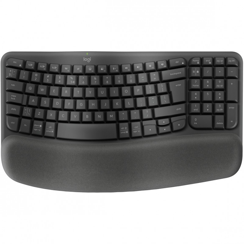 "Logitech Wave Keys. Keyboard form factor: Full-size (100%). Keyboard style: Curved. Connectivity technology: Wireless, Device interface: RF Wireless + Bluetooth, Keyboard key switch: Membrane, Keyboard layout: QWERTY. Wrist rest. Recommended usage: Office. Product colour: Graphite"\n
