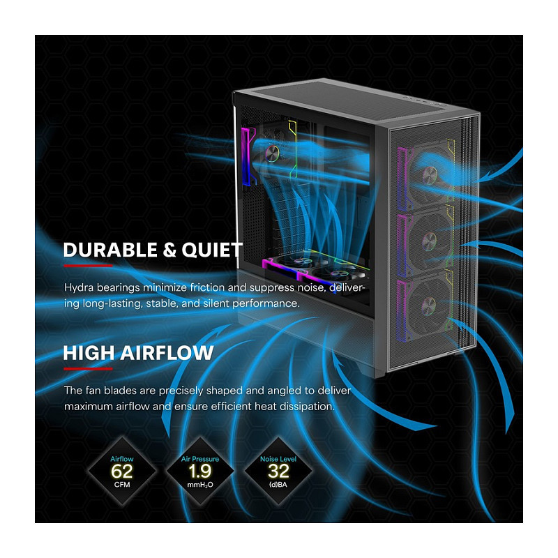 Precisely shaped and angled fan blades maximize airflow for efficient heat dissipation.