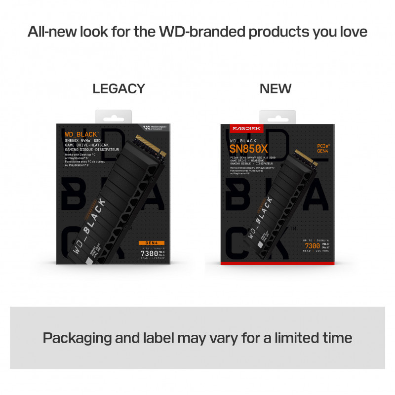 "Western Digital WD_BLACK™ SN850X NVMe™ SSD POWERED BY SANDISK 4 TB, [With Heatsink]. SSD capacity: 4 TB, SSD form factor: M.2, Read speed: 7300 MB/s, Write speed: 6600 MB/s, Component for: PC"\n"Built for elite gaming.