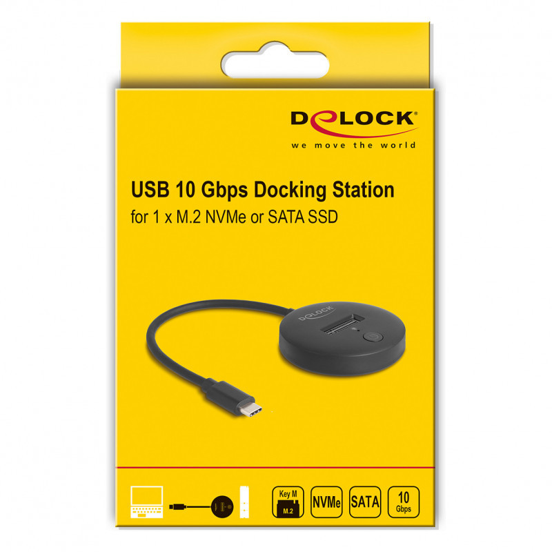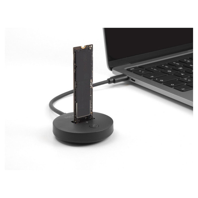 "DeLOCK M.2 Docking Station for M.2 NVMe / SATA SSD with USB 10 Gbps USB Type-C male. Storage media type: SSD, Storage drive interface: M.2, PCI Express, Serial ATA, Storage drive sizes supported: M.2. Host interface: USB 3.2 Gen 1 (3.1 Gen 1) Type-C. Product colour: Black, LED indicators: Access, Power. Windows operating systems supported: Windows 10, Windows 11, Linux operating systems supported: Linux Kernel 5.15, Mac operating systems supported: Mac OS X 13.0 Ventura. Package type: Box"\n"This M.2 docking station by Delock enables the installation of an M.2 PCIe NVMe SSD or M.2 SATA SSD and it can be connected via USB to the PC or laptop.
