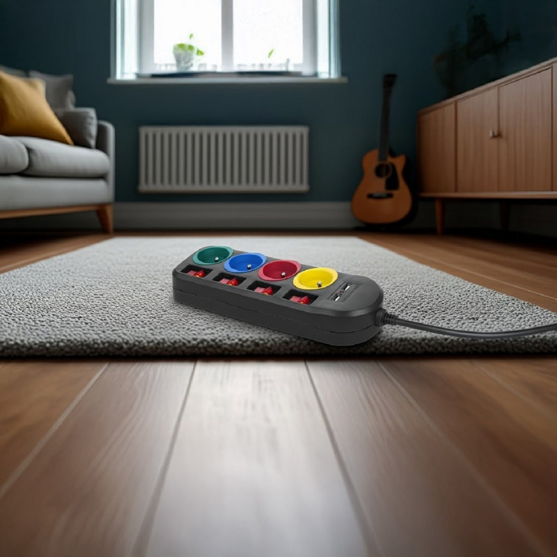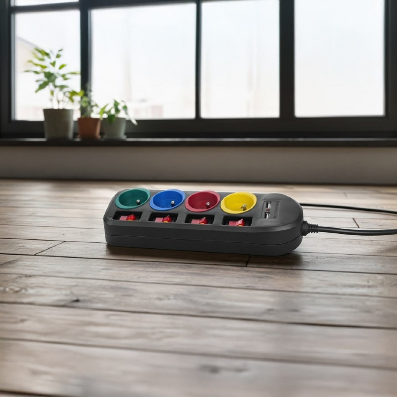 "Maclean" maitinimo juosta, 4 kištukinių lizdų ilgintuvas + 2xUSB, su jungikliais, 250VAC/10A, 2,1A 5V, 1,5 m, juoda, MCE229 B