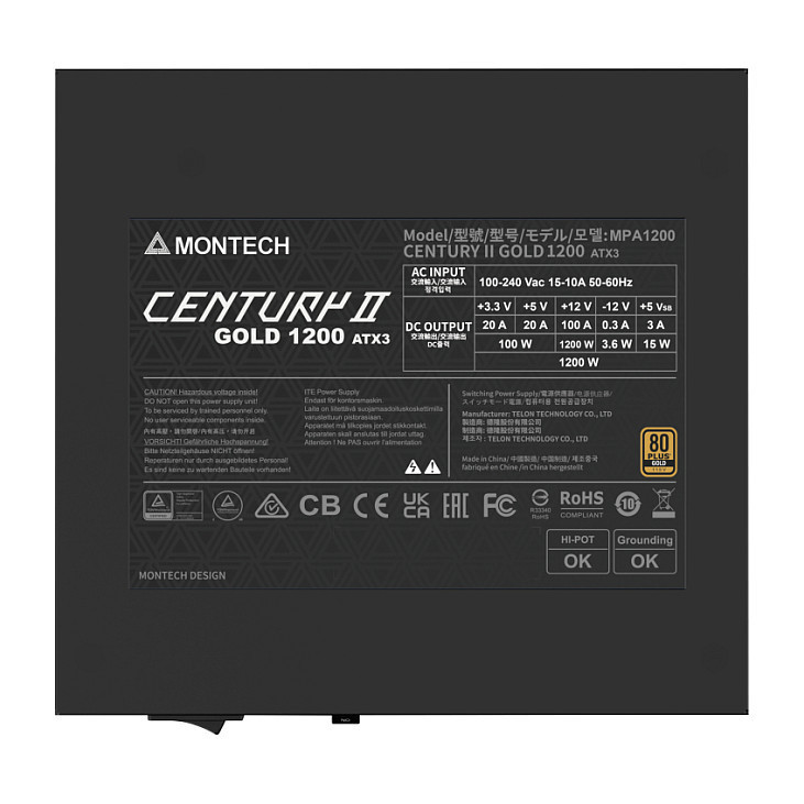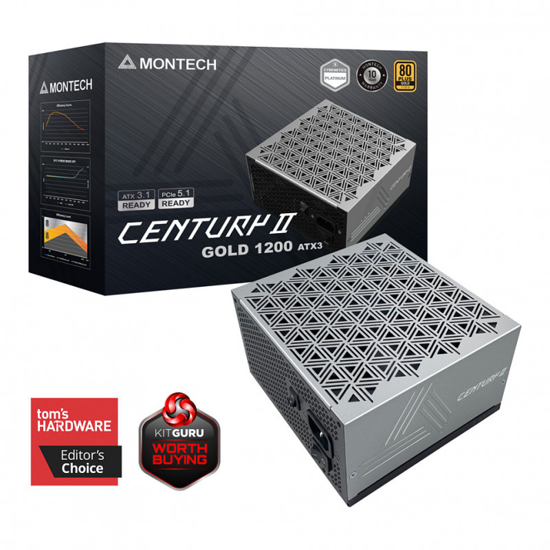 "Montech CENTURY II 1200W. Total power: 1200 W, AC input voltage: 100 - 240 V, AC input frequency: 50/60 Hz. Motherboard power connector: 20+4 pin ATX, Motherboard power cable length: 60 cm, SATA power cable length: 950 mm. Purpose: PC, Power supply unit (PSU) form factor: ATX, 80 PLUS certification: 80 PLUS Gold. Product colour: Silver, Black, Cooling type: Active, Fan diameter: 13.5 cm. Compliance certificates: BSMI, CB, CCC, EAC, Electromagnetic Compatibility (EMC), Federal Communications Commission (FCC),..."\n"Powering the Next CENTURY