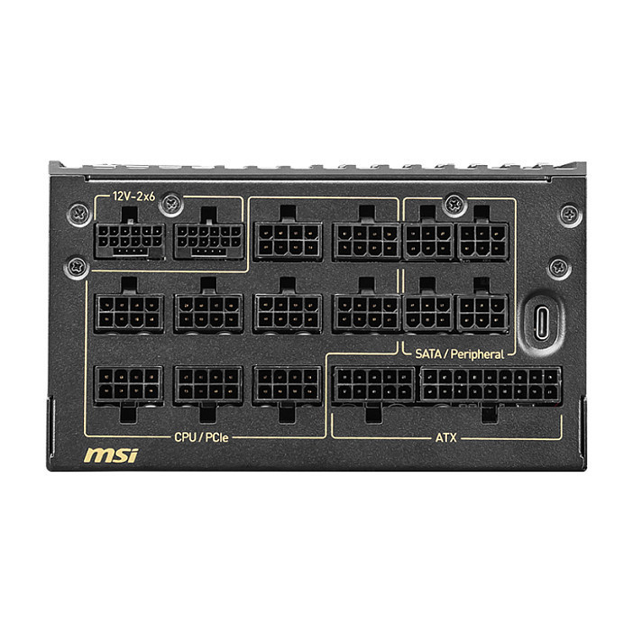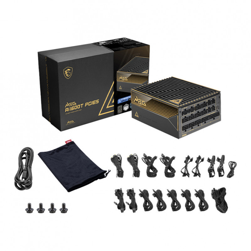 "MSI MEG Ai1600T PCIE5. Total power: 1600 W, AC input voltage: 100 - 240 V, Power Factor Correction (PFC) type: Active. Motherboard power connector: 24-pin ATX, Cabling type: Fully-Modular. Purpose: PC, Power supply unit (PSU) form factor: ATX, 80 PLUS certification: 80 PLUS Titanium. Product colour: Black, Fan diameter: 13.5 cm. Width: 190 mm, Depth: 150 mm, Height: 86 mm"\n"MSI's flagship MEG series exemplifies relentless innovation, continuously setting new benchmarks in the gaming hardware space. This trailblazing series employs pioneering technology to push the boundaries of gaming, consistently leading with innovations that redefine what gamers expect.