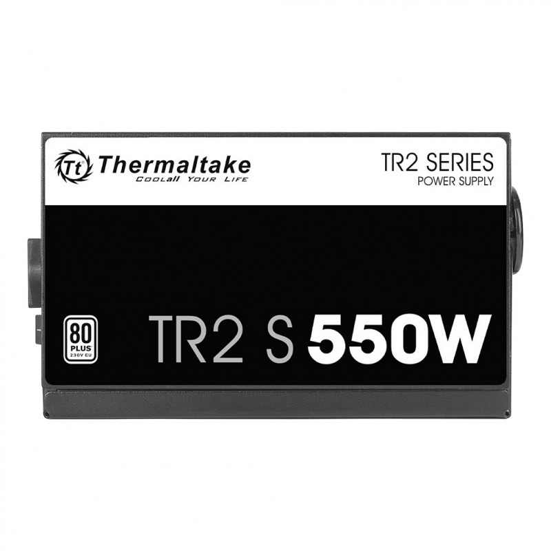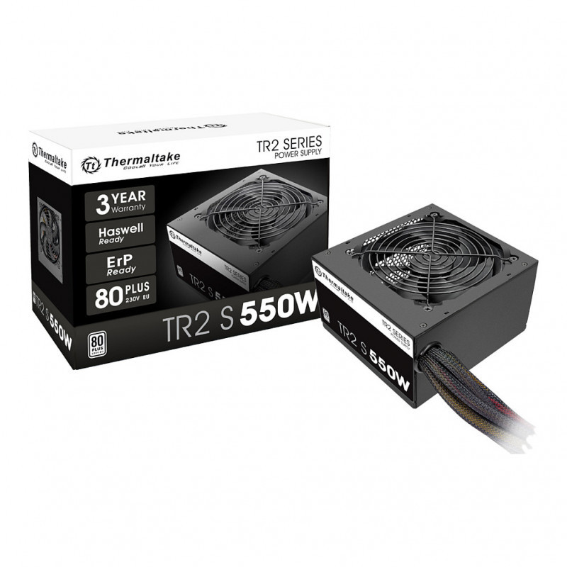 "Thermaltake TR2 S 550W. Total power: 550 W, AC input voltage: 200 - 240 V, AC input frequency: 50 Hz. Motherboard power connector: 20+4 pin ATX, Motherboard power cable length: 60 cm, SATA power cable length: 500 mm. Purpose: PC/Server, Power supply unit (PSU) form factor: ATX, 80 PLUS certification: 80 PLUS. Product colour: Black, Cooling type: Active, Fan diameter: 12 cm. Certification: FCC/ICES/CB/cTUVus"\n"TR2 S 550W (DC to DC Version)