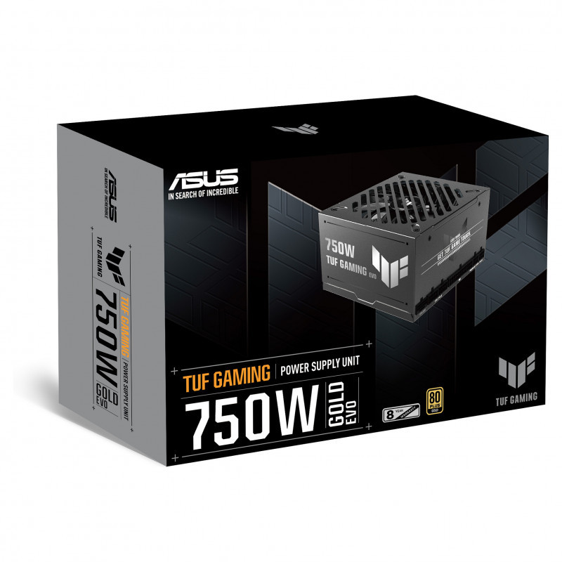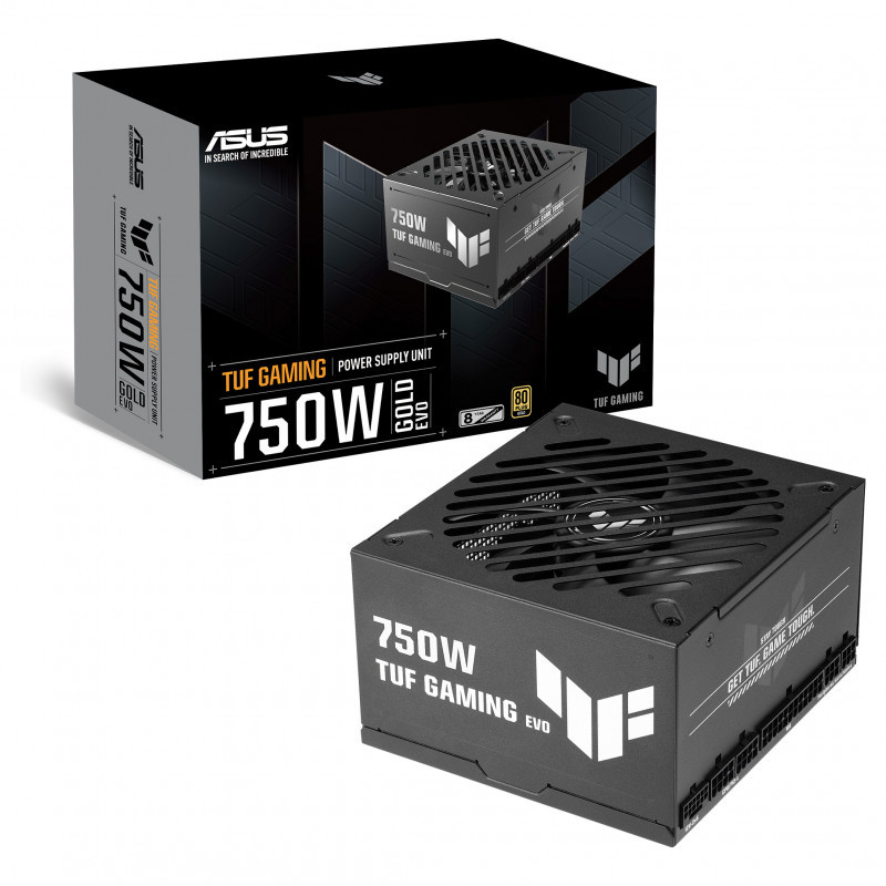 "ASUS TUF-GAMING-750G-EVO. Total power: 750 W, AC input voltage: 100 - 240 V, Power Factor Correction (PFC) type: Active. Motherboard power connector: 20+4 pin ATX, Motherboard power cable length: 50 cm, SATA power cable length: 400,120 mm. Purpose: PC, Power supply unit (PSU) form factor: ATX, 80 PLUS certification: 80 PLUS Gold. Product colour: Black, Cooling type: Active, Number of fans: 1 fan(s). Cables included: CPU, PCIe, Peripheral (Molex), SATA"\n"TUF Gaming Gold EVO Series