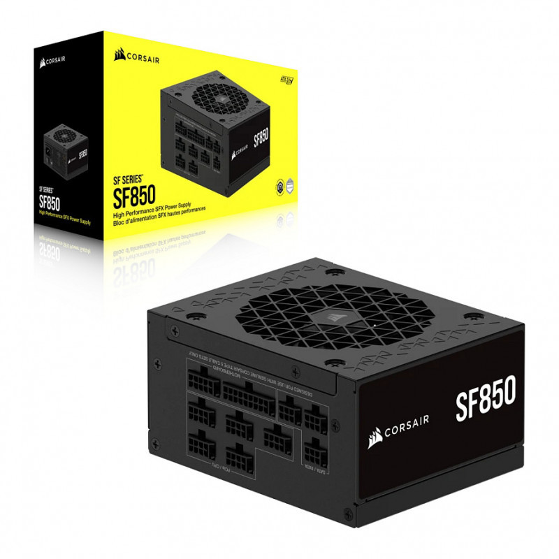 "Corsair SF Series CP-9020256-EU. Total power: 850 W, AC input voltage: 100 - 240 V, AC input frequency: 47 - 63 Hz. Motherboard power connector: 24-pin ATX, Motherboard power cable length: 30 cm, SATA power cable length: 445 mm. Purpose: PC, Power supply unit (PSU) form factor: SFX, 80 PLUS certification: 80 PLUS Platinum. Product colour: Black, Cooling type: Active, Fan diameter: 9.2 cm. Cables included: AC, CPU, PATA, PCIe, SATA"\n"SF PLATINUM SERIES