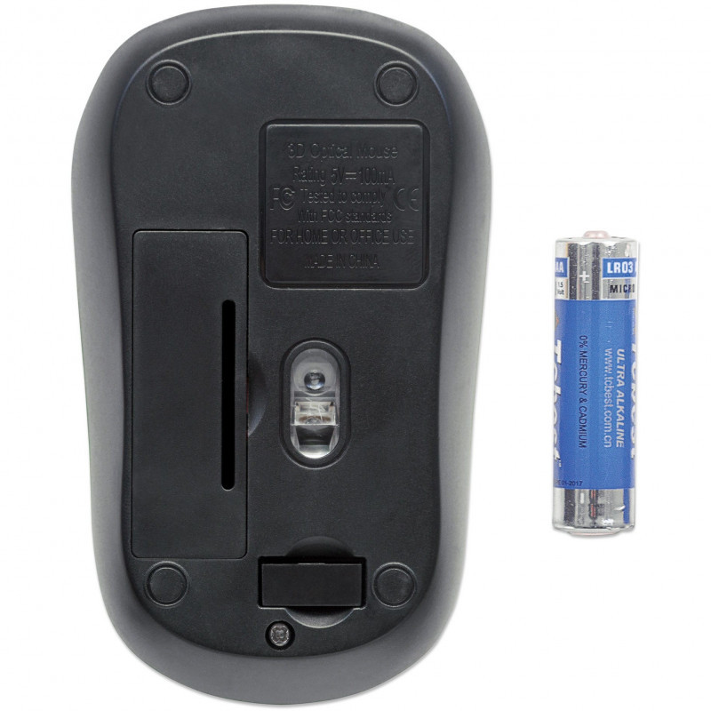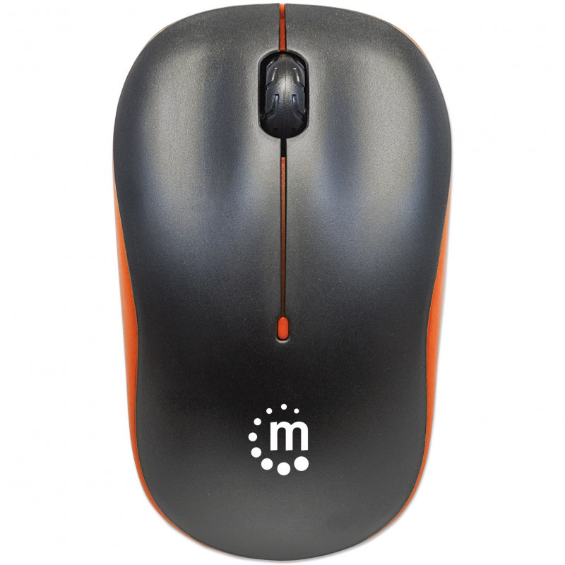 "Manhattan Success Wireless Mouse, Black/Orange, 1000dpi, 2.4Ghz (up to 10m), USB, Optical, Three Button with Scroll Wheel, USB micro receiver, AA battery (included), Low friction base, Three Year Warranty. Form factor: Ambidextrous. Movement detection technology: Optical, Device interface: RF Wireless, Movement resolution: 1000 DPI, Buttons type: Pressed buttons, Buttons quantity: 3, Scroll type: Wheel. Power source: Batteries. Product colour: Black, Orange"\n"The Manhattan Success Wireless Optical Mouse combines modern design with advanced precision and performance. Its full-sized shape and three-button configuration provide direct access to essential commands with minimal wrist movement. A non-slip texture applied to critical surfaces helps provide a secure, comfortable grip. The remarkably small yet powerful USB micro receiver with 2.4GHz technology provides an effective range of up to 10 m (33 ft.) and stores in a special onboard compartment or remains installed for true wireless convenience."