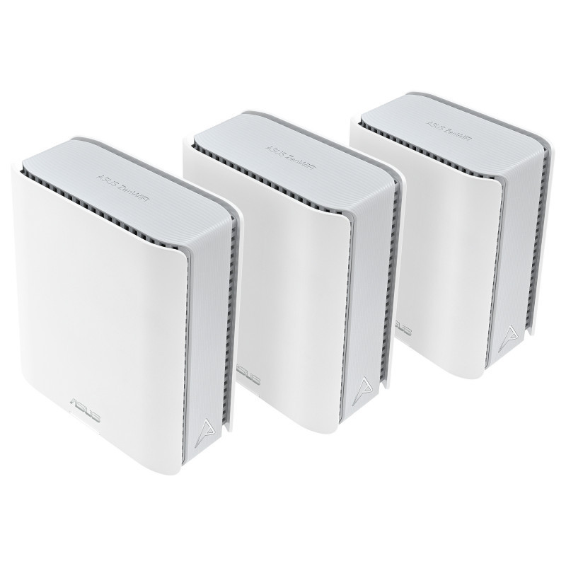 "ASUS ZenWiFi BT8. Product colour: White, Antenna type: Internal, Product type: Mesh router. Wi-Fi band: Tri-band (2.4 GHz / 5 GHz / 6 GHz), Top Wi-Fi standard: Wi-Fi 7 (802.11be), WLAN data transfer rate (max): 8643 Mbit/s. Internal memory: 1000 MB, Flash memory: 128 MB, Firewall security: Firewall. AC input voltage: 110 - 240 V, AC input frequency: 50 - 60 Hz, AC adapter output voltage: 12 V. Width: 159 mm, Depth: 72 mm, Height: 186 mm"\n"Worry-Free Smart Home Mesh