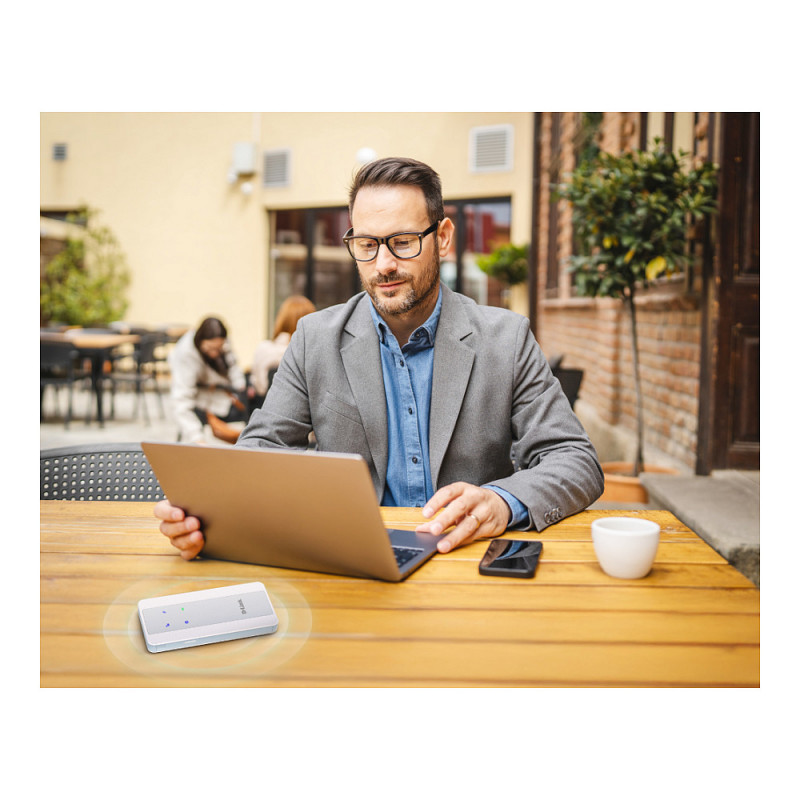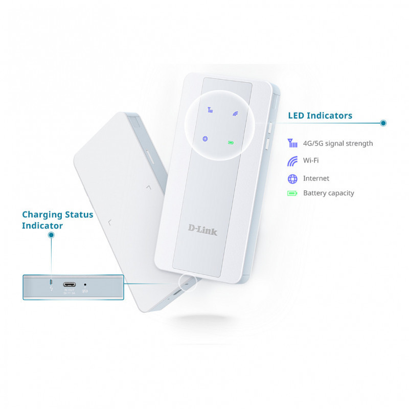 "D-Link 5G NR AX1800 Wi-Fi 6 Mobile Hotspot. Device type: Cellular network modem, Product colour: White, Market positioning: Portable. Networking standards: IEEE 802.11a, IEEE 802.11ac, IEEE 802.11ax, IEEE 802.11b, IEEE 802.11g, IEEE 802.11n. Wi-Fi standards: Wi-Fi 6 (802.11ax), WLAN data transfer rates supported: 1800 Mbit/s, Wi-Fi band: Dual-band (2.4 GHz / 5 GHz). Data network: 3G, 4G, 5G, 3G standards: WCDMA, 4G standard: LTE-TDD & LTE-FDD. USB port type: USB Type-C"\n"5G NR AX1800