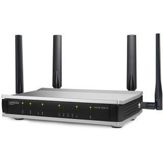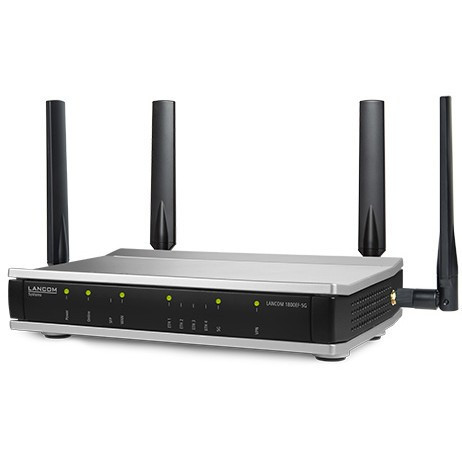 "LANCOM 1800EF-5G (EU). Product colour: Black, Silver, Cable lock slot type: Kensington, Number of fans: 1 fan(s). Antenna type: External, Antenna connector type: SMA, Antenna gain level (max): 2 dBi. Supported network protocols: Ethernet over GRE-Tunnel (EoGRE), L2TPv3, ARP-Lookup, LLDP, DHCP option 82,..., Routing protocols: BGP4, LISP, OSPFv2, RIP-2, VRRP. Ethernet LAN data rates: 10,100,1000 Mbit/s, Networking standards: IEEE 802.1Q, IEEE 802.3az, Mobile network generation: 5G. Security algorithms: 3DES, 1024-bit RSA, 2048-bit RSA, 4096-bit RSA, AES, FIPS 140, SHA-1, SHA-256, SHA-384, SHA-512, Authentication method: PAP, CHAP, MS-CHAP, MS-CHAPv2"\n"High-availability networking with 5G, fiber, and Ethernet