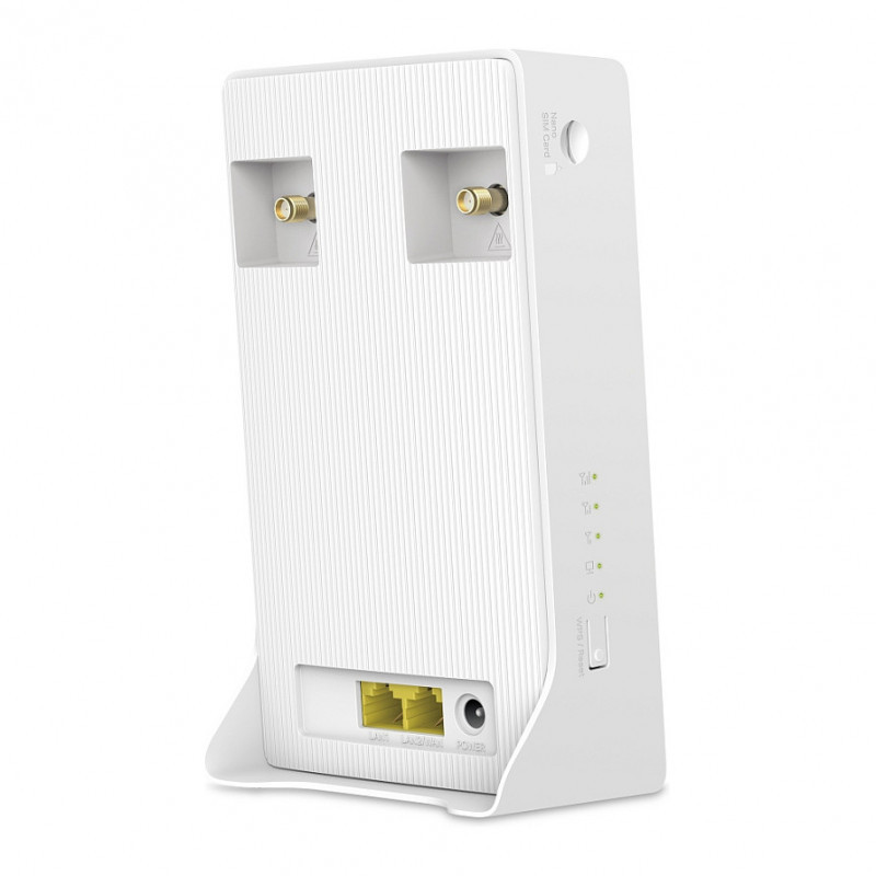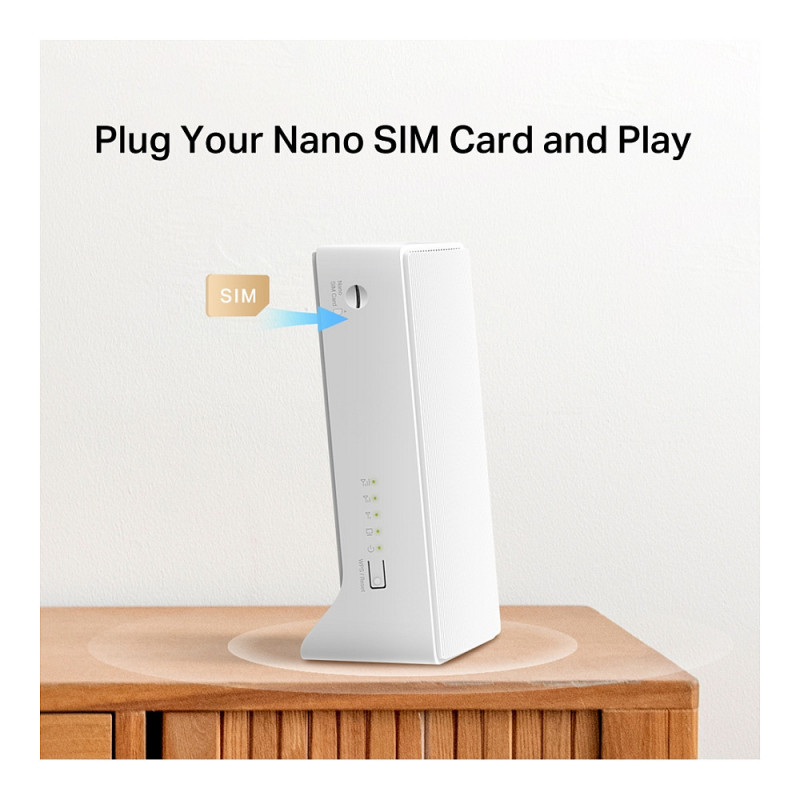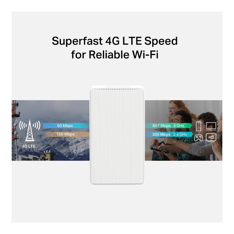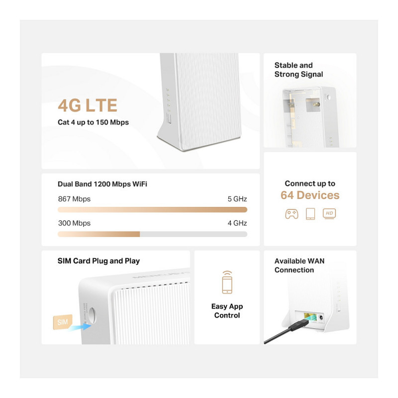 "Mercusys AC1200 Wireless Dual Band 4G LTE Router. WAN connection type: RJ-45. Wi-Fi band: Dual-band (2.4 GHz / 5 GHz), Top Wi-Fi standard: Wi-Fi 5 (802.11ac), WLAN data transfer rate (max): 867 Mbit/s. Ethernet LAN interface type: Ethernet, Ethernet LAN data rates: 10,100 Mbit/s. Mobile network generation: 4G, 3G standards: HSPA+, UMTS, 4G standard: LTE-TDD & LTE-FDD. Security algorithms: WPA, WPA-PSK, WPA2, WPA2-PSK"\n"Plug Your Nano SIM Card and Play