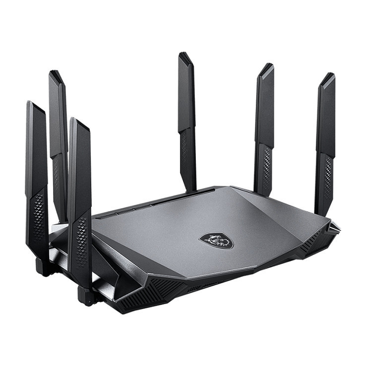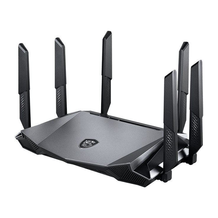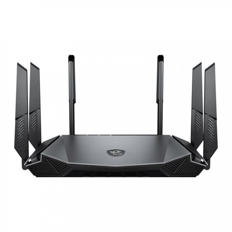 "MSI RadiX AX6600 WiFi 6 Tri-Band. Wi-Fi band: Tri-band (2.4 GHz / 5 GHz / 5 GHz), Top Wi-Fi standard: Wi-Fi 6 (802.11ax), WLAN data transfer rate (max): 4804 Mbit/s. Ethernet LAN interface type: Gigabit Ethernet, Ethernet LAN data rates: 10,100,1000 Mbit/s. Security algorithms: WPA, WPA2, WPA3. Product type: Tabletop router, Product colour: Black, LED indicators: LAN, Power, WAN, WLAN. Antenna design: External"\n"MORE CONNECTIVITY, LESS LATENCY
