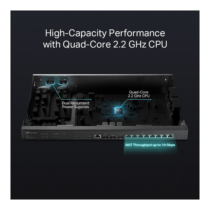 "TP-Link Omada VPN Router with 10G Ports. Networking standards: IEEE 802.1Q, Ethernet interface type: Gigabit Ethernet, Cabling technology: 10/100/1000Base-T(X). NAT functionality: One-to-One NAT; Multi-Net NAT; Virtual Server; Port Triggering; NAT-DMZ; FTP/H.323/SIP/IPSec/PPTP.... Flash memory: 256 MB, Internal memory: 4096 MB, Internal memory type: DDR4. Product colour: Black. AC input voltage: 100 - 240 V, AC input frequency: 50 - 60 Hz"\n"Future-Proof Your Business with 10G Enterprise Connectivity