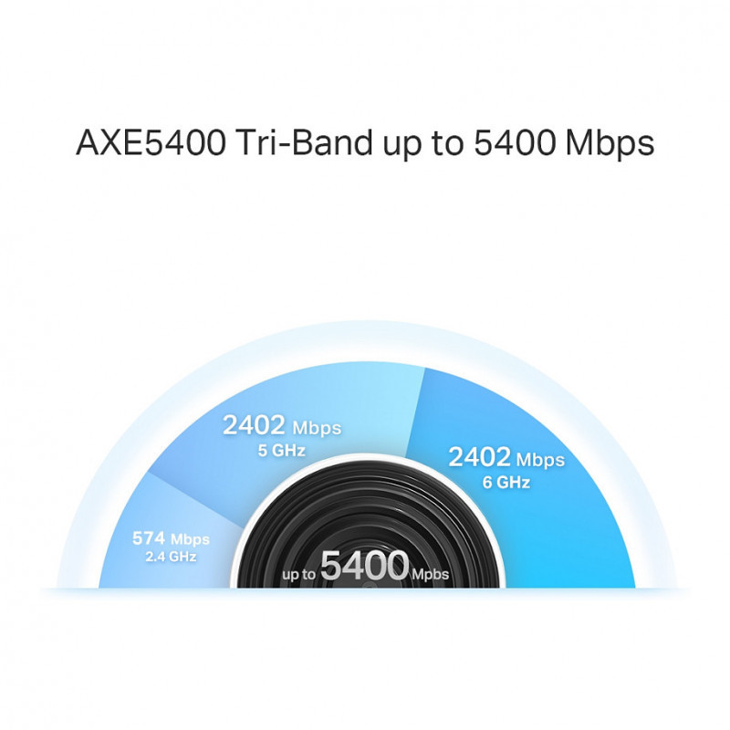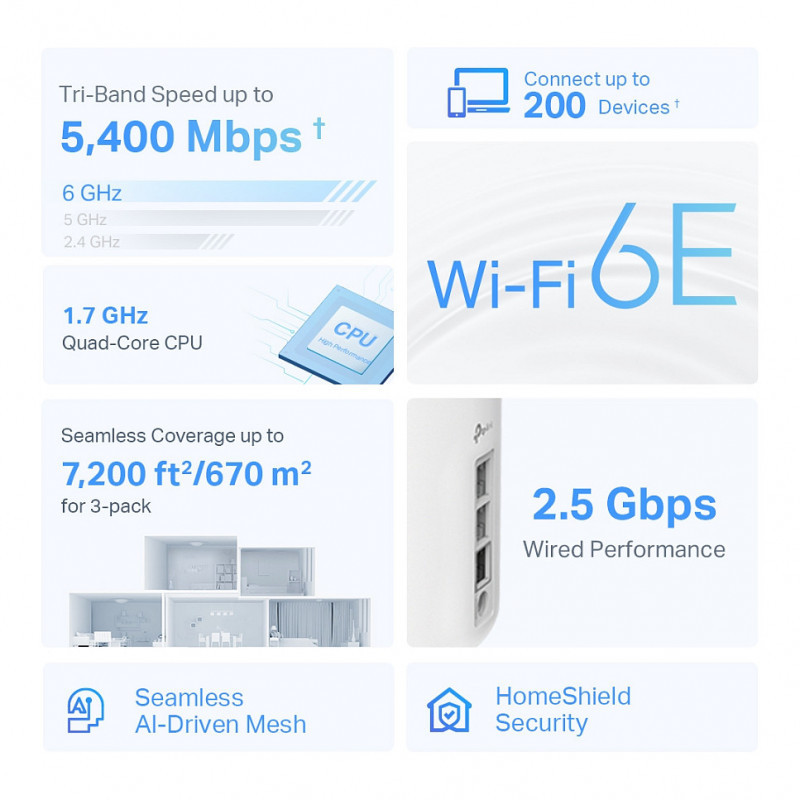 "TP-Link AXE5400 Whole Home Mesh Wi-Fi 6E System(Tri-Band). Product colour: White, Antenna type: Internal, Product type: Mesh system. Wi-Fi band: Tri-band (2.4 GHz / 5 GHz / 6 GHz), Top Wi-Fi standard: Wi-Fi 6E (802.11ax), Wi-Fi standards: 802.11a, Wi-Fi 5 (802.11ac), 802.11b, Wi-Fi 6 (802.11ax), 802.11g, Wi-Fi 4 (802.11n), Wi-Fi 6E.... Processor frequency: 1.7 GHz, Firewall security: SPI Firewall, Parental control features: Bedtime, Custom profiles, Pause the Internet, Time rewards, Content filter, Family time, Time.... AC input voltage: 100 - 240 V, AC input frequency: 50 - 60 Hz, AC adapter output voltage: 12 V. Certification: CE, FCC, RoHS"\n"Faster, Stronger, Better