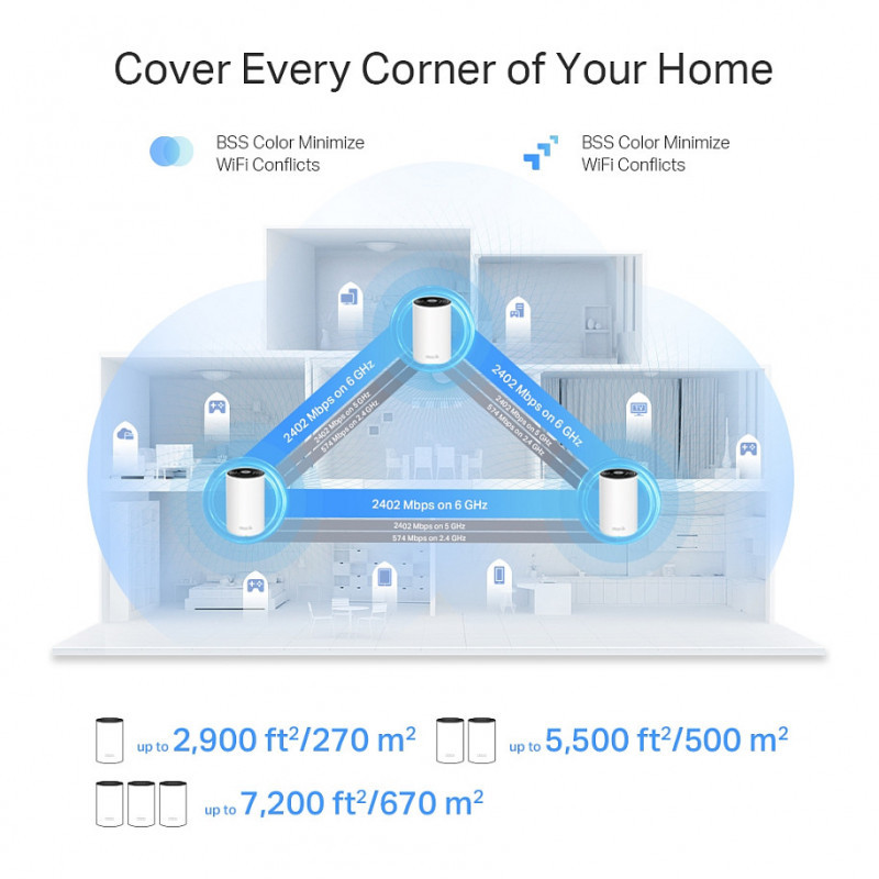 Deco XE75 Pro eliminates weak signal areas with clearer, stronger whole-home WiFi generated by BSS (Base Service Station) Coloring and Beamforming technologies as the WiFi dead zone killer. Thus, there will be no more searching around for a stable connection.