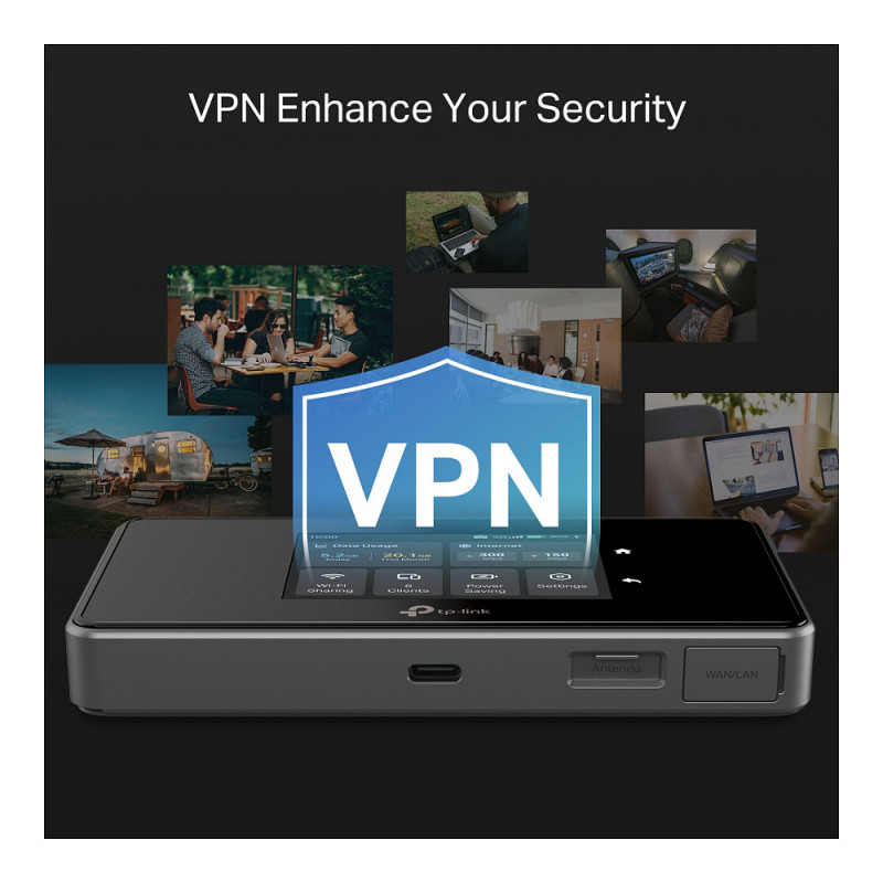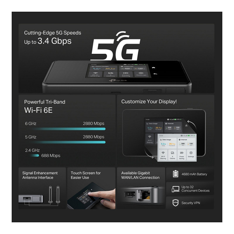 "TP-Link M8550(EU). Device type: Cellular network router, Product colour: Black, Market positioning: Portable. Wi-Fi standards: 802.11a, 802.11b, 802.11g, Wi-Fi 4 (802.11n), Wi-Fi 5 (802.11ac), Wi-Fi 6 (802.11ax), WLAN data transfer rates supported: 200 Mbit/s. Data network: 4G, 5G, LTE, 3G standards: HSPA, HSPA+, WCDMA, 4G standard: TD-LTE & FDD-LTE. Compatible memory cards: MicroSD (TransFlash), Nano Memory (NM). Security algorithms: WPA-PSK, WPA2-PSK"\n