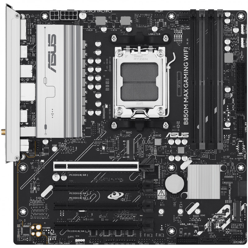 "ASUS B850M MAX GAMING WIFI. Processor manufacturer: AMD, Processor socket: Socket AM5, Compatible processor series: AMD Ryzen 7000 Series, AMD Ryzen 8000 Series, AMD Ryzen 9000 Series. Supported memory types: DDR5-SDRAM, Maximum internal memory: 256 GB, Memory slots type: DIMM. Supported storage drive interfaces: M.2, SATA III, Supported storage drive types: HDD & SSD, RAID levels: 0, 1, 5, 10. Ethernet interface type: Gigabit Ethernet, Top Wi-Fi standard: Wi-Fi 6 (802.11ax), Wi-Fi standards: Wi-Fi 6 (802.11ax). Component for: PC, Motherboard form factor: micro ATX, Motherboard chipset family: AMD"\n"B850M MAX GAMING WIFI