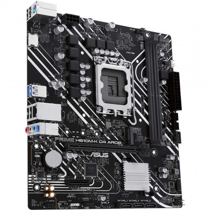 "ASUS PRIME H610M-K D4 ARGB. Processor manufacturer: Intel, Processor socket: LGA 1700, Compatible processor series: Intel® Celeron®, Intel® Pentium® Gold, Intel® Core™ i3, Intel® Core™ i5, Intel® Core™.... Supported memory types: DDR4-SDRAM, Maximum internal memory: 64 GB, Memory slots type: DIMM. Supported storage drive interfaces: M.2, SATA III, Supported storage drive types: HDD & SSD. Ethernet interface type: Gigabit Ethernet. Component for: PC, Motherboard form factor: micro ATX, Motherboard chipset family: Intel"\n"H610M-K D4 ARGB