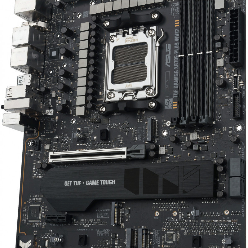 "ASUS TUF GAMING X870E-PLUS WIFI7. Processor manufacturer: AMD, Processor socket: Socket AM5, Compatible processor series: AMD Ryzen 7000 Series, AMD Ryzen 8000 Series, AMD Ryzen 9000 Series. Supported memory types: DDR5-SDRAM, Maximum internal memory: 256 GB, Memory slots type: DIMM. Supported storage drive interfaces: M.2, PCI Express 4.0, PCI Express 5.0, SATA III, Supported storage drive types: HDD & SSD, RAID levels: 0, 1, 5, 10. Ethernet interface type: 2.5 Gigabit Ethernet, Top Wi-Fi standard: Wi-Fi 7 (802.11be), Wi-Fi standards: Wi-Fi 7 (802.11be). Component for: PC, Motherboard form factor: ATX, Motherboard chipset family: AMD"\n"ASUS TUF GAMING X870E-PLUS WIFI7 takes all the essential elements of the latest AMD Ryzen™ processors and combines them with game-ready features and proven durability. Engineered with military-grade components, an upgraded power solution and a comprehensive cooling system, this motherboard goes beyond expectations with rock-solid and stable performance for marathon gaming. TUF GAMING motherboards also undergo rigorous endurance testing to ensure that they can handle conditions where others may fail. This platform delivers the power and connectivity that advanced AI PC applications demand.