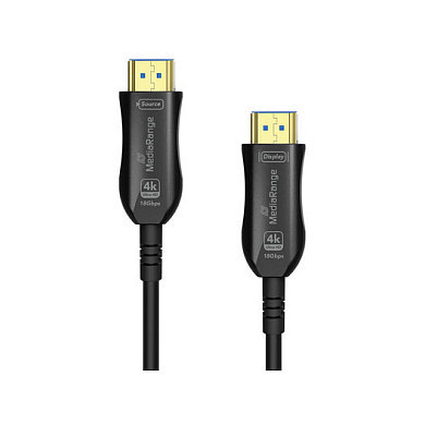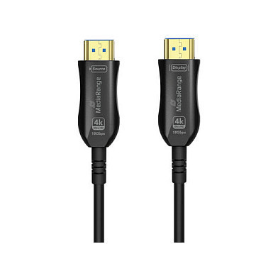 "MediaRange MRCS223. Cable length: 15 m, Connector 1: HDMI Type A (Standard), Connector 1 gender: Male, Connector 2: HDMI Type A (Standard), Connector 2 gender: Male, Connector contacts plating: Gold, HDMI version: 2.0, 3D, Data transfer rate: 18 Gbit/s, Audio Return Channel (ARC), Product colour: Black"\n"MediaRange Active Optical HDMI™ High Speed Ethernet Cables are engineered to deliver stunning visuals and seamless connectivity for your audio-visual experience, whether for entertainment, gaming, or professional presentations. Our wide range of dependable high quality cables guarantees a reliable and efficient connectivity solution for various applications. With data transfer rate of up to 18 Gbps, this cable is designed to meet the demands of modern digital devices.