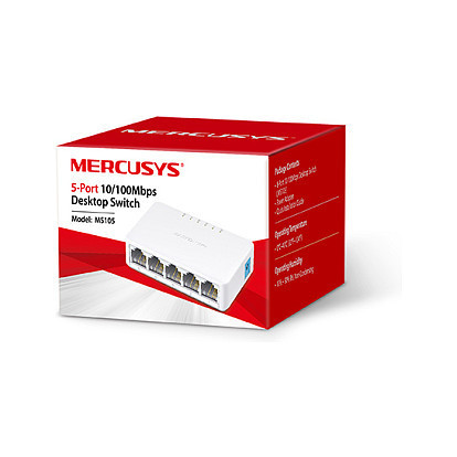 "Mercusys 5-Port 10/100Mbps Desktop Switch. Switch type: Unmanaged. Basic switching RJ-45 Ethernet ports type: Fast Ethernet (10/100), Basic switching RJ-45 Ethernet ports quantity: 5. Full duplex, Networking standards: IEEE 802.3, IEEE 802.3u, IEEE 802.3x. Power connector: DC-in jack"\n"Easy Wired Network Expansion
