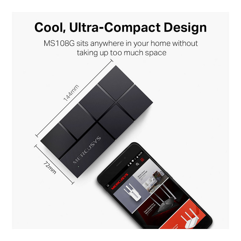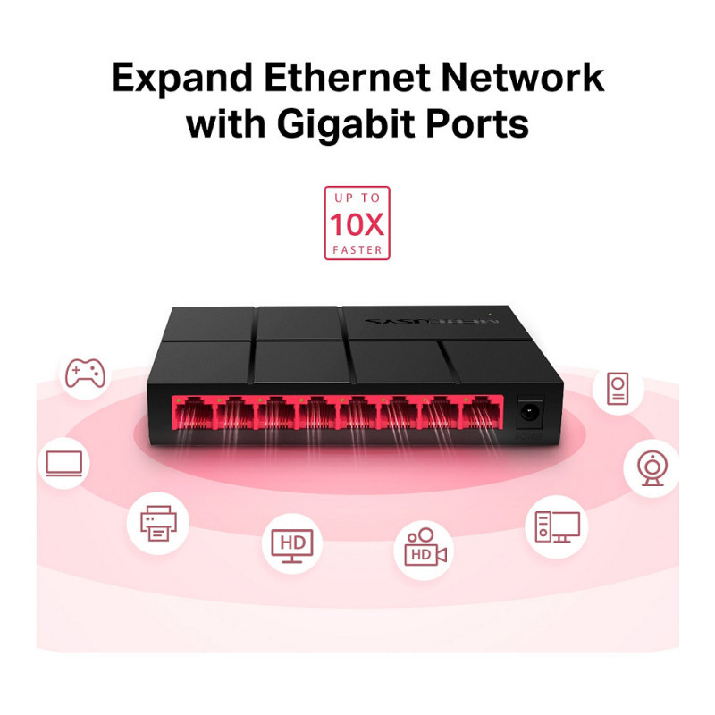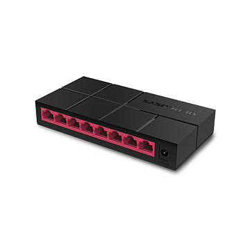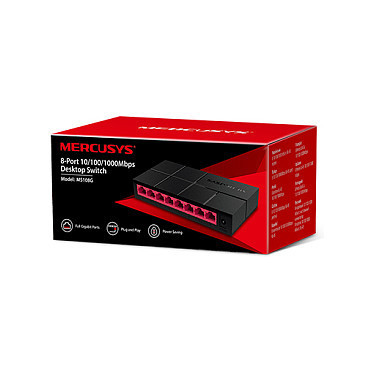 "Mercusys 8-Port 10/100/1,000 Mbps Desktop Switch. Switch type: Unmanaged. Basic switching RJ-45 Ethernet ports type: Gigabit Ethernet (10/100/1000), Basic switching RJ-45 Ethernet ports quantity: 8. Full duplex, Networking standards: IEEE 802.3, IEEE 802.3u, IEEE 802.3x. Power connector: DC-in jack"\n"More Efficient Transmission