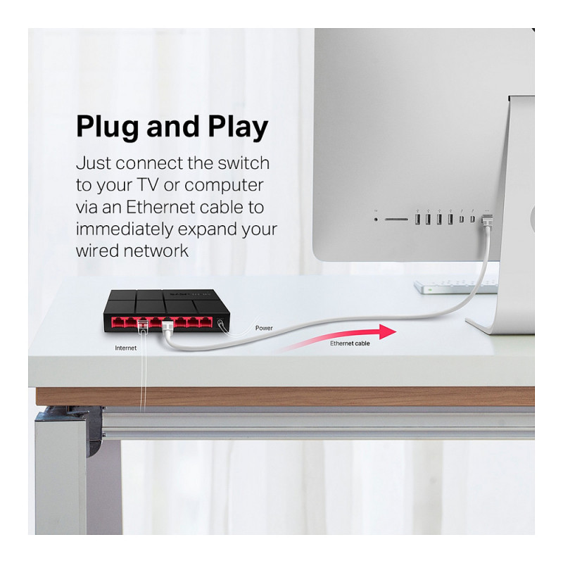 Forget about complicated installation. Just connect the switch to your TV or computer via an Ethernet cable to immediately expand your wired network. Absolutely no configuration is required.