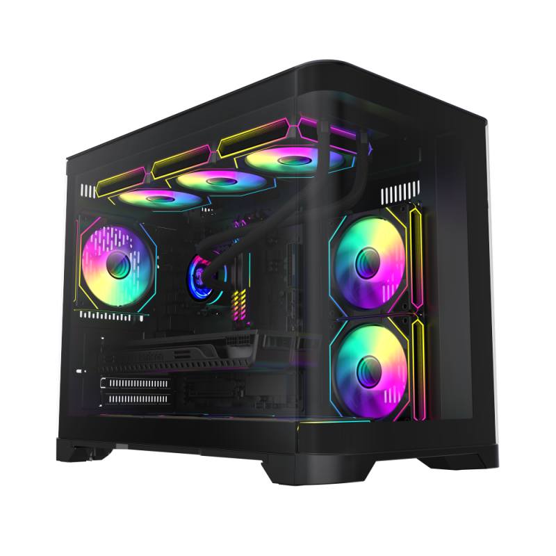 The View 290 TG ARGB Snow Mid Tower Chassis is an ATX case featuring a curved tempered glass front panel, a tempered glass side panel, rotational PCI-E slots, a GPU bracket, and three 120mm ARGB Lite hydraulic bearing fans for stunning aesthetics. Its RGB lighting can be controlled by motherboard software from ASUS, GIGABYTE, MSI, and ASRock. The chassis can install up to nine 120mm fans and a 360mm AIO radiator, providing good cooling support.