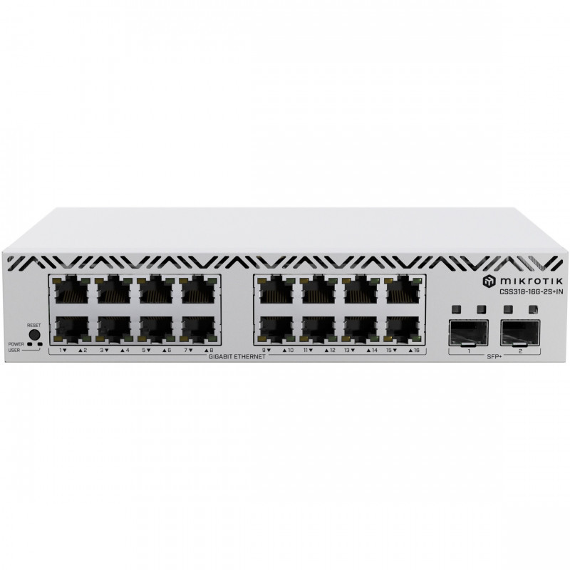 "Mikrotik CSS318-16G-2S+IN. Switch type: Managed. Basic switching RJ-45 Ethernet ports type: Gigabit Ethernet (10/100/1000), Basic switching RJ-45 Ethernet ports quantity: 16, Installed SFP+ modules quantity: 2. Rack mounting"\n"With 16 Gigabit Ethernet ports and 2 SFP+ 10G uplink ports, you get all the connectivity you need without unnecessary bulk. Stack two units side by side in a single 1U rack space for even greater flexibility and scalability.