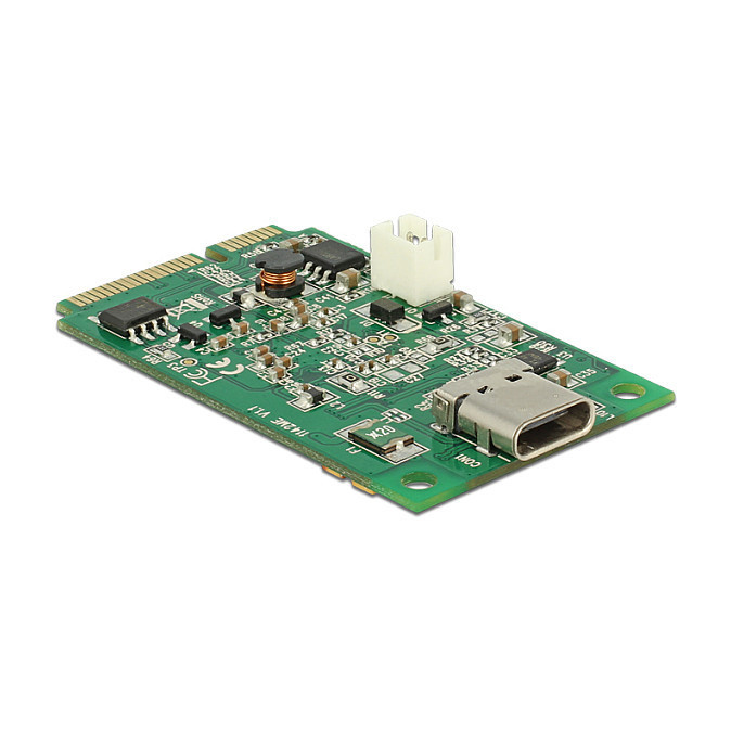 "DeLOCK 95259. Host interface: Mini PCI Express, Output interface: USB 3.2 Gen 1 (3.1 Gen 1), Expansion card form factor: Full-height. Country of origin: China. Chipset: Asmedia ASM1142, Data transfer rate (max): 10 Gbit/s. Package type: Box"\n"This Mini PCIe module by Delock expands the system by one internal USB-C™ port."