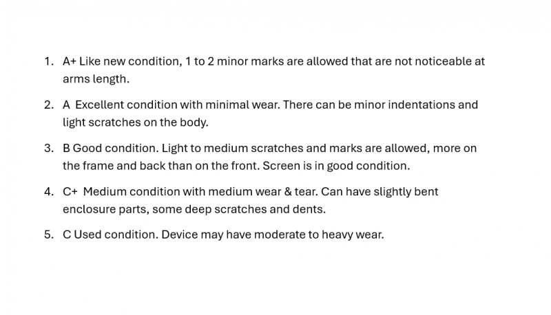 „Grade A“ reiškia, kad įrenginys yra puikios būklės, beveik be naudojimo ženklų.