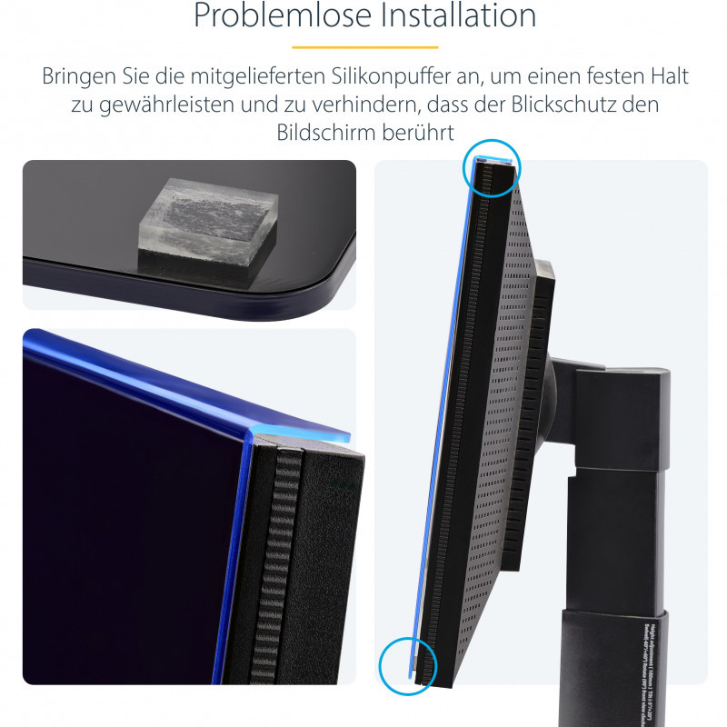 Apply the included silicone bumpers to provide a firm grip to hold the acrylic frame secure from the top of the monitor, and to keep it from touching the screen.