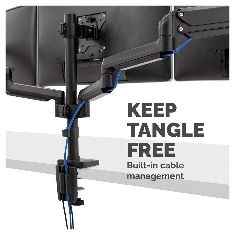 "Fellowes Platinum Series Triple Monitor Arm - Monitor Mount for Three 7KG 27 Inch Screens - Adjustable Triple Monitor Desk Mount - Tilt 45° Pan 180° Swivel 360° Rotation 360°, VESA 75 x 75/100 x 100 - Black. Mounting: Clamp/Grommet, Maximum weight capacity: 7 kg, Maximum screen size: 76.2 cm (30""), Minimum VESA mount: 75 x 75 mm, Maximum VESA mount: 100 x 100 mm. Tilt angle range: -45 - 45°. Product colour: Black"\n"Sitting or standing with bad posture all day using a computer is bad for your health. Leaning forwards or tilting your head up or down not only causes back and neck strain but is also bad for your eyes. The Fellowes Platinum Series triple monitor stand will improve your ergonomic posture and reduce back neck and eye strain. Triple screen working means you can view more screen content and can use multiple programs simultaneously. With ever shrinking office spaces, using an adjustable monitor stand means you can free up valuable work space to become more organised and productive. With effortless adjustment you can collaborate and share information with colleagues easily, making them ideal for hot desks or shared desks. This fully independent adjustable monitor stand by Fellowes can pan 180 Degree, tilt +/-45° (90°) and can rotate 360° via gas spring technology allowing for effortless movement. Built in dual USB connectivity and intuitive cable management allows you to stay connected and minimise clutter at the same time with the Fellowes Platinum Series triple monitor mount. Easily mounted via clamp or grommet, each arm holds a monitor up to 7kg (up to 27-Inch monitors) and meets VESA monitor standards."