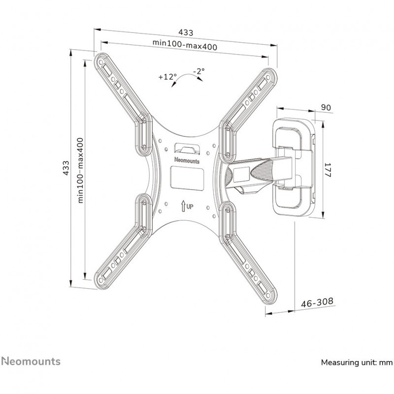 "Neomounts WL40-540BL14 TV mount wall 32-55"" - full motion - easy install. Maximum weight capacity: 35 kg, Minimum screen size: 81.3 cm (32""), Maximum screen size: 139.7 cm (55""), Minimum VESA mount: 100 x 100 mm, Maximum VESA mount: 400 x 400 mm. Tilt angle range: -2 - 12°, Swivel angle range: 0 - 30°, Angle of rotation: 6°, Distance to the wall (min): 4.6 cm, Distance to the wall (max): 30.8 cm. Product colour: Black"\n"The Neomounts WL40-540BL14 LEVEL is a full motion wall mount for flat screens up to 55"" with a maximum weight capacity of 35 kg. The versatile tilt (14°) and swivel (30°) technology allows you to create the optimum viewing angle. The mount can be levelled for the perfect installation.