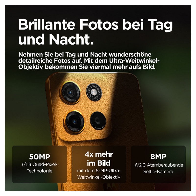 moto g15 brings you cinematic entertainment at its best. Watch your favourite programmes and films come to life on a super sharp and bright 6.72” Full HD+ display – even outdoors in sunlight. Listen to sound all around thanks to powerful stereo speakers with bass boost and Dolby Atmos®. Capture beautifully detailed photos with the 50 MP(1) camera system, eliminating those annoying bars from artificial light sources. Fuel up fast with TurboPower™ charging(2) then go for longer with a 5200 mAh battery. Enjoy the premium look and feel of vegan leather, along with the protection of a water-repellent design(3) and Corning® Gorilla® Glass 3. Plus, experience fast performance and plenty of storage, so there’s always room for fun. Brighten each day with moto g15."