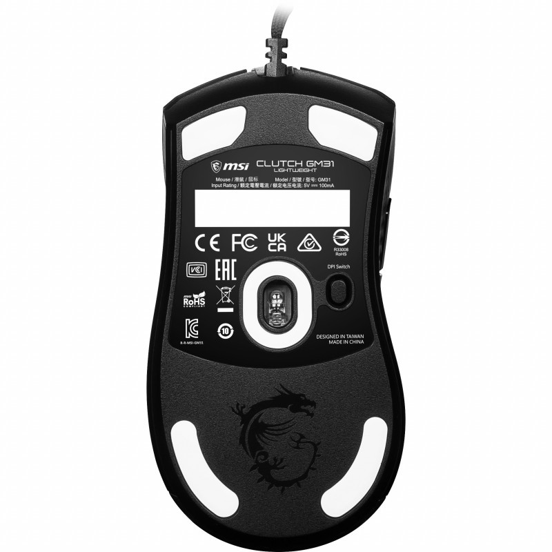 "MSI CLUTCH GM31 LIGHTWEIGHT. Form factor: Right-hand. Movement detection technology: Optical, Device interface: USB Type-A, Movement resolution: 12000 DPI, Response time: 1 ms, Buttons type: Pressed buttons, Buttons quantity: 6, Scroll type: Wheel. Power source: Cable. Product colour: Black"\n"Upgrade your arsenal with a small yet ergonomic lightweight gaming mouse - CLUTCH GM31 LIGHTWEIGHT. The CLUTCH GM31 LIGHTWEIGHT is packed with various features that provide performance boosts to your gameplay. Experience every move with comfort.