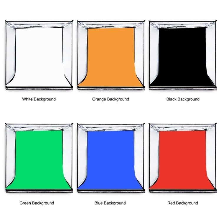 Namiot posiada otwieraną górną pokrywę, dzięki czemu zdjęcia możemy wykonać także z góry. W zestawie znajdziesz też tła fotograficzne w różnych kolorach, dzięki czemu z łatwością dostosujesz kolorystykę do konkretnego produktu.