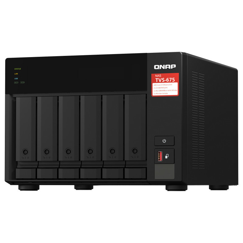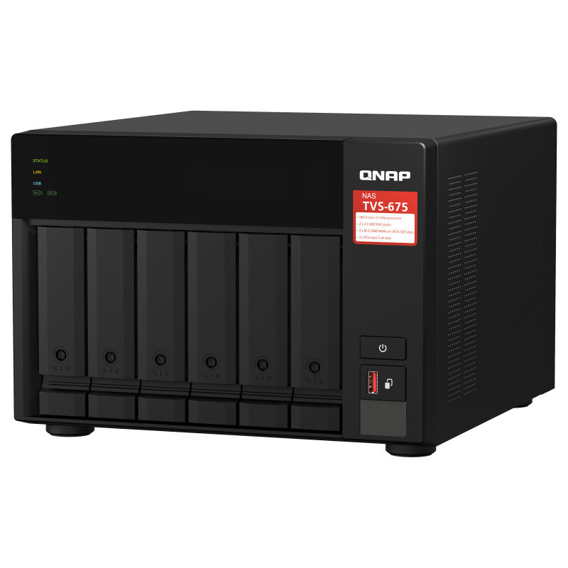 "QNAP TVS-675. Type: NAS. Chassis type: Tower. Device class: Small & Medium Business. Processor family: ZhaoXin KaiXian KX-6000, Processor model: KX-U6580, Processor frequency: 2.5 GHz. Internal memory: 8 GB, Internal memory type: DDR4. Total installed storage capacity: 0 TB. Operating system installed: QuTS hero"\n"Cost-efficient 8-core 2.5GbE NAS, supporting M.2 SATA/NVMe SSD caching, PCIe expansion, and 4K HDMI display