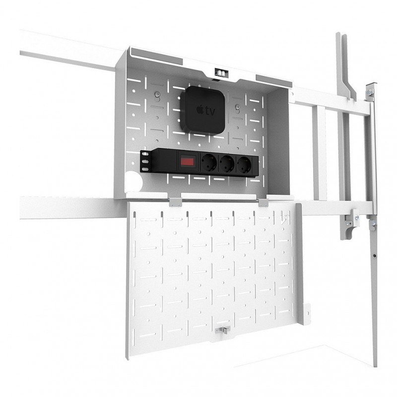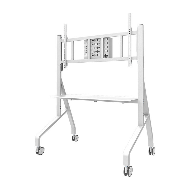 Designed with a sturdy structure, the MOVE Go XL offers the perfect solution for large and ultra-wide 105"" (touch) screens. The floor stand offers manual height adjustment in 2 preset positions, ranging from 129 to 139 cm, ensuring optimal viewing heights. For extra security, the screen can be fixed in place by locking the brackets using a padlock (not included). Additionally, a multimedia shelf (front and back mountable, max. 10 kg) and lockable, ventilated hardware compartment with cable opening are included and optional for installation.