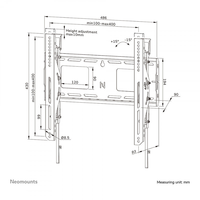 "Neomounts WL35-750BL14 Heavy duty wall mount 42-75"" - tilt - lockable - fast installation - TÜV. Maximum weight capacity: 100 kg, Minimum screen size: 106.7 cm (42""), Maximum screen size: 190.5 cm (75""), Minimum VESA mount: 100 x 100 mm, Maximum VESA mount: 400 x 400 mm. Height adjustment range: 0 - 10 mm, Tilt angle range: -15 - 15°, Distance to the wall (max): 9.3 cm. Product colour: Black"\n"The Neomounts WL35-750BL14 LEVEL is the ultimate tiltable solution for securely mounting an interactive or heavy weight display up to 75"" with a maximum capacity of 100 kg. The toolless tilt adjustment (+15°/-15°) allows you to create the optimum viewing angle. This heavy-duty wall mount features a sturdy high profile wall plate and is engineered for stability and precision, ensuring your screen is securely mounted even on uneven surfaces. The mount features individual adjustable brackets (10 mm) for securely adjusting the display height or levelling it.