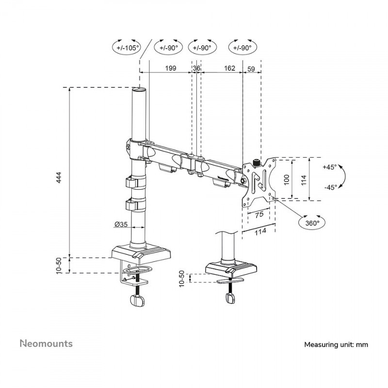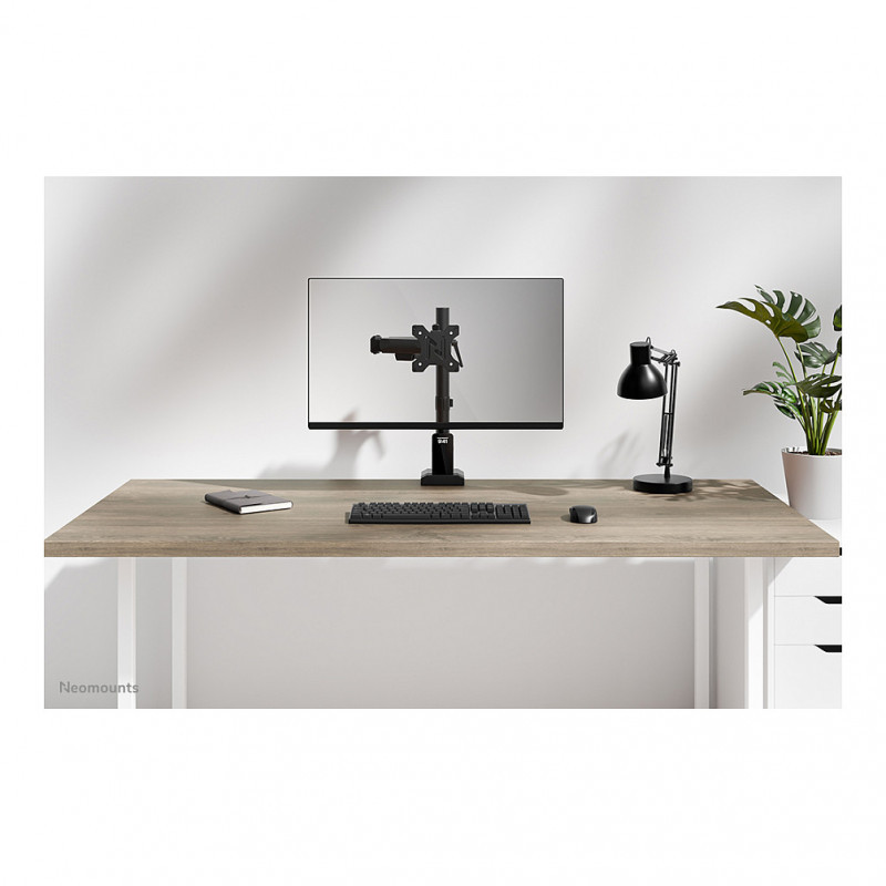 "Neomounts DS60-600BL1 Monitor arm 10-32"" - Quick-fix - 180°-stop. Mounting: Clamp/Grommet, Maximum weight capacity: 8 kg, Minimum screen size: 25.4 cm (10""), Maximum screen size: 81.3 cm (32""), Minimum VESA mount: 75 x 75 mm, Maximum VESA mount: 100 x 100 mm. Height adjustment, Swivel angle range: -90 - 90°, Tilt angle range: -45 - 45°. Product colour: Black"\n"The Neomounts DS60-600BL1 NERO monitor arm is the perfect choice for those looking for a sturdy and versatile solution for monitors up to 32"" with a weight capacity of 8 kg. This full motion monitor arm offers maximum flexibility thanks to its versatile tilt (90°), rotate (360°) and swivel (180°) technology, enabling you to always find the optimal viewing angle for an ergonomic working posture.