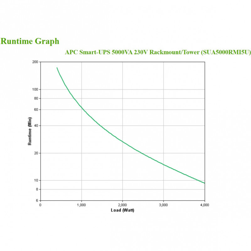 "APC Smart-UPS SUA5000RMI5U - 5000VA, 8x C13, 2x C19 outlet, NMC, Rackmount/Tower. UPS topology: Line-Interactive, Output power capacity: 5 kVA, Output power: 4000 W. AC outlet types: C13 coupler, C19 coupler, Power plug: Hard Wire 3-wire, AC outlets quantity: 10 AC outlet(s). Battery technology: Sealed Lead Acid (VRLA), Battery capacity: 1632 VAh, Typical backup time at full load: 9.4 min. Form factor: Rackmount/Tower, Product colour: Black, Rack capacity: 5U. Compliance certificates: RoHS, Certification: C-tick, CE, EN 50091-1, EN 50091-2, GOST, GS Mark, VDE, REACH, PEP, EOLI"\n"Stay always online and prevent data loss