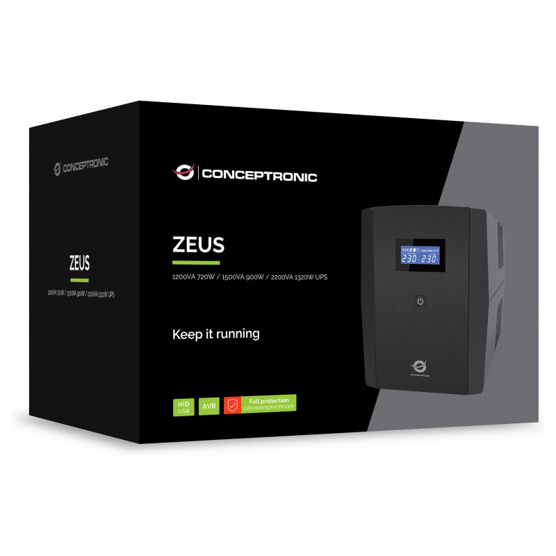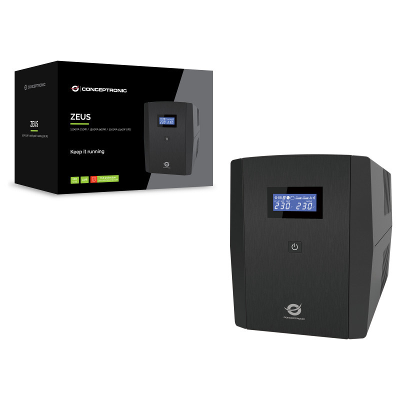 "Conceptronic ZEUS03G 1200VA 720W UPS, UK socket x 4, HID USB, RJ45 In/Out, AVR. UPS topology: Line-Interactive, Output power capacity: 1.2 kVA, Output power: 720 W. AC outlet types: Type G (BS 1363), AC outlets quantity: 4 AC outlet(s), USB port type: USB Type-B. Battery technology: Lead-Acid, Battery capacity: 14 Ah, Battery voltage: 24 V. Form factor: Desktop, Product colour: Black, Display type: LCD. Compliance certificates: CE, RoHS"\n"The Conceptronic UPS provides long-lasting, reliable battery backup for the home or small office. The unit is simple to install and operate, offering an easy and safe way of protecting your systems from harmful power surges and failures. The UPS comes with modem/LAN protection, a powerful microprocessor and a fault indicator which warns against dangerous wiring. Stylish, compact design makes the UPS ideal for limited office and home working spaces."