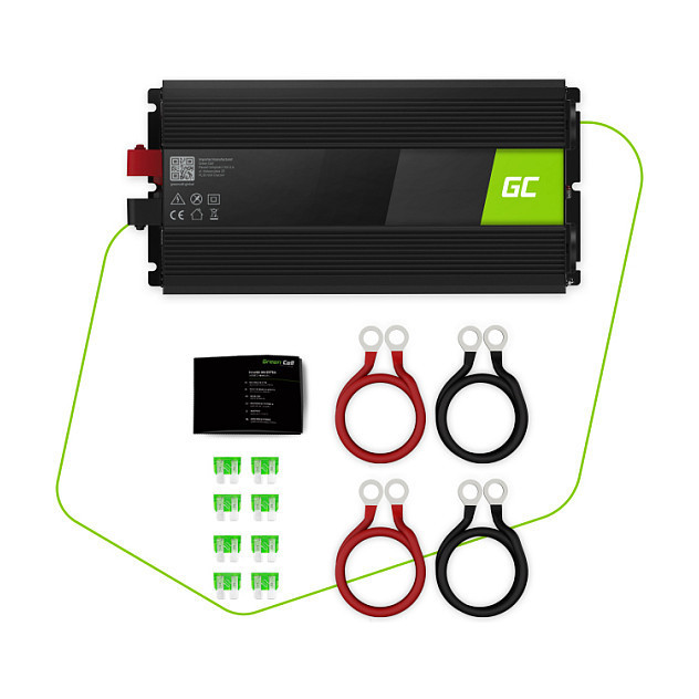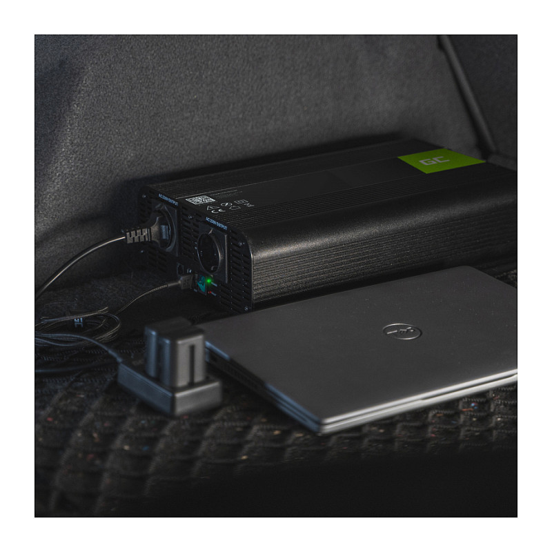 "Green Cell INV21. Purpose: Car inverter, Power supply type: Auto, Input voltage: 24 V. Product colour: Black, Cooling type: Active. Width: 209 mm, Depth: 410 mm, Height: 93 mm. Quantity per pack: 1 pc(s), Cables included: DC"\n"Green Cell Inverter