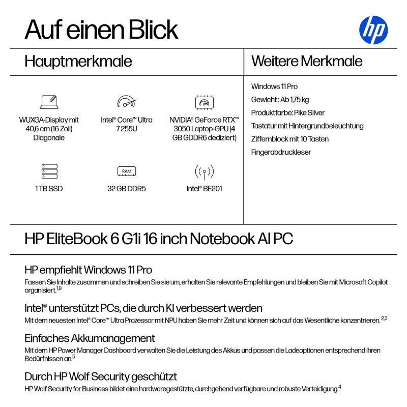 "HP EliteBook 6 G1i AI. Product type: Laptop, Form factor: Clamshell. Processor family: Intel Core Ultra 7, Processor model: 255U. Display diagonal: 40.6 cm (16""), HD type: WUXGA, Display resolution: 1920 x 1200 pixels. Internal memory: 32 GB, Internal memory type: DDR5-SDRAM. Total storage capacity: 1 TB, Storage media: SSD. On-board graphics card model: Intel Graphics. Mobile network generation: 4G. Operating system installed: Windows 11 Pro. Product colour: Silver"\n"AI-ready for enterprise productivity