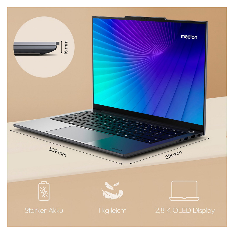 "MEDION 30040132. Product type: Laptop, Form factor: Clamshell. Processor family: Intel Core 5, Processor model: 120U, Processor frequency: 5 GHz. Display diagonal: 35.6 cm (14""), HD type: 2.8K, Display resolution: 2880 x 1800 pixels. Internal memory: 16 GB, Internal memory type: DDR4-SDRAM. Total storage capacity: 512 GB, Storage media: SSD. On-board graphics card model: Intel Graphics. Operating system installed: Windows 11 Home. Product colour: Black"\n
